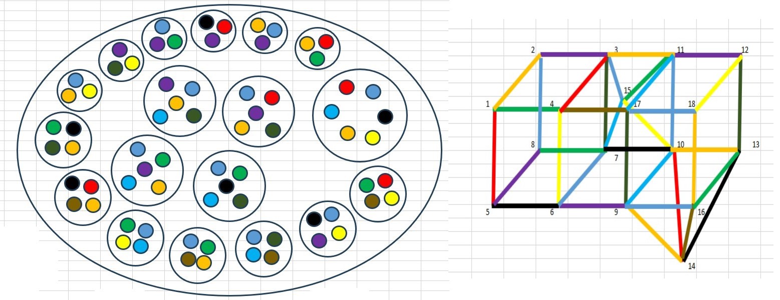Nebo naopak vyjít z těchto dvanácti Nic a na nich vytvořit 8 vzájemně se překrývajících tříčlených skupin. (na obrázku vlevo)